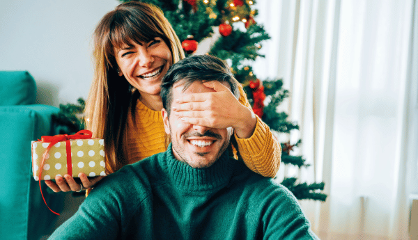 Lachende Frau hält Mann im weihnachtlich geschmückten Raum die Augen zu; Geschenk in der Hand.
