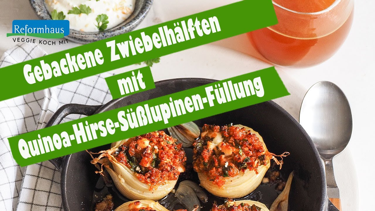 Homemade! Dieses Gericht ist ein Superfood von nebenan. Die Zwiebelhälften mit herzhafter Quinoa-Hirse-Süßlupinen-Füllung sind ein toller Snack und auch als Hauptgericht sehr lecker!
