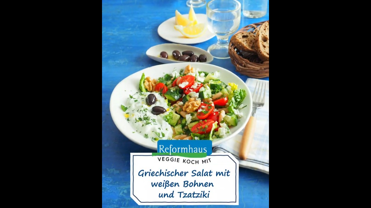 Ballaststoffreicher Genuss: In diesem Griechischen Salat mit Tzatziki mischen sich weiße Bohnen und Walnüsse mit Römersalat, Tomaten und Gurken. Die gekochten Hülsenfrüchte helfen dabei, den Cholesterinspiegel zu senken und den Blutzuckerspiegel stabil zu halten.
