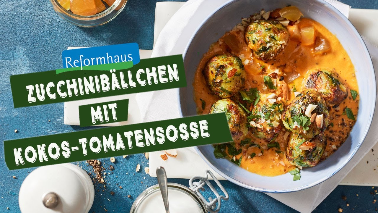 2 EL Olivenöl in einer großen Pfanne erhitzen. Die Zucchinibällchen darin evtl. in 2 Portionen rundherum bei mittlerer Hitze 4–5 Minuten braten. Die Zucchinibällchen aus der Pfanne nehmen und mit der Kokos-Tomatensoße anrichten. Mit 30 g gehackten Reformhaus® Mandelkernen braun bio, Rest Petersilie und 20 g Reformhaus® Ingwer Goldstücke bio bestreuen.