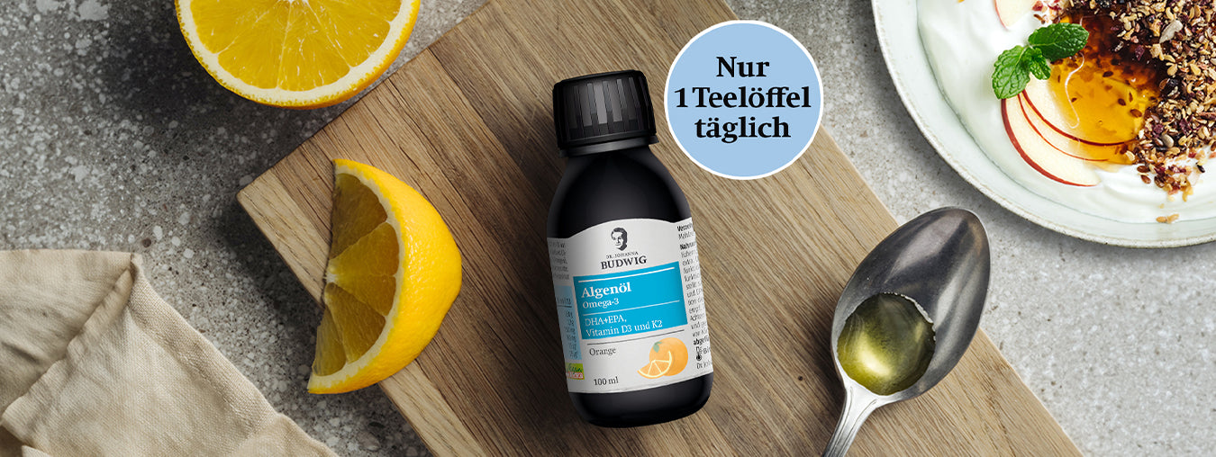 Dank seiner hohen Qualität und perfekt ergänzt durch fruchtiges Orangenöl, ist das Dr. Budwig Omega-3 Algenöl harmonisch in Geruch und Geschmack und gut verdaulich. Mit nur einem Teelöffel täglich ist viel getan! Ob direkt vom Löffel zu einer Mahlzeit oder eingerührt in die Budwig Creme oder das Budwig Porridge. Nur ein Teelöffel Dr. Budwig Omega-3 Algenöl liefert mehr als 2 g Omega-3-Fettsäuren sowie 1.000 IE Vitamin D.